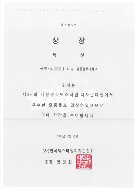 2025년도 섬유디자인 전공 제 36회 대한민국 텍스타일디자인 공모전 수상
