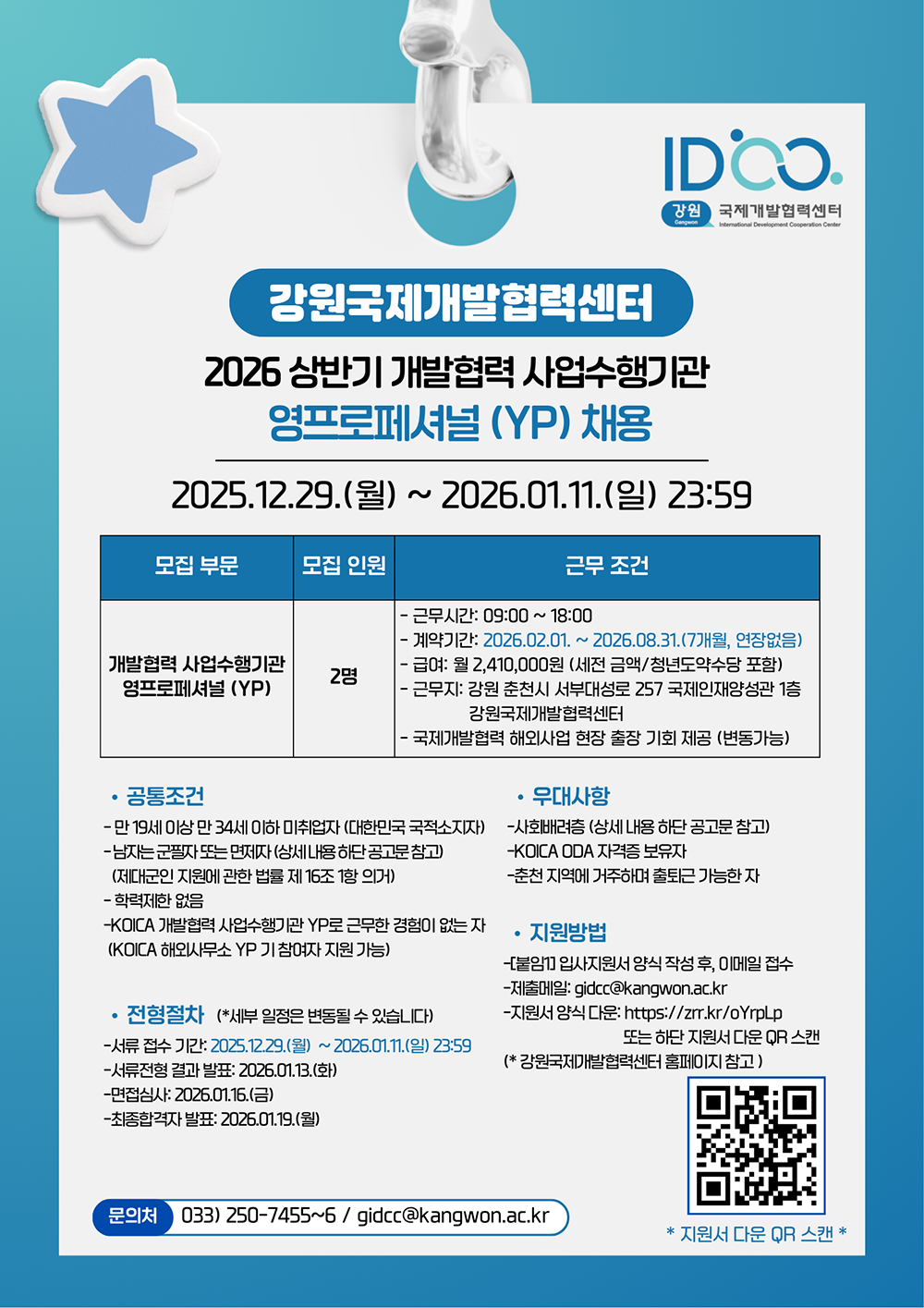 6. 지원 방법: 강원국제개발협력센터 홈페이지 공지사항 및 홍보 포스터 QR 코드 스캔하여 양식 작성 후, 기관 메일 gidcc@kangwon.ac.kr로 발송  (메일 제목: 개발협력 YP_이름)