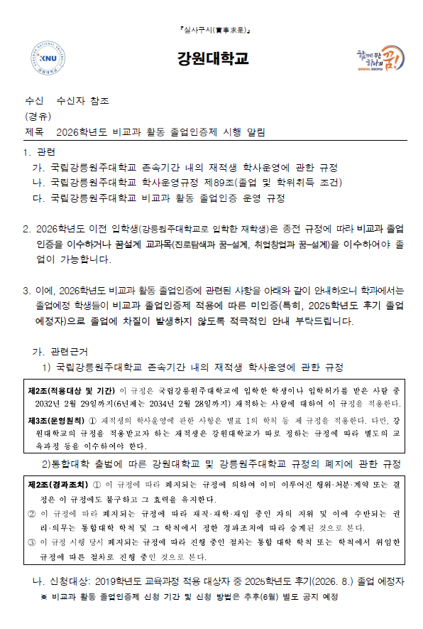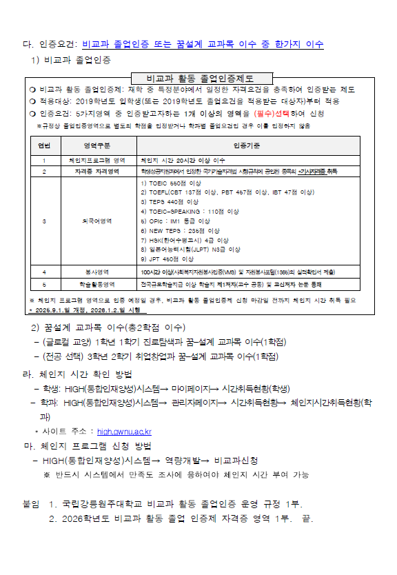 2026학년도 비교과 활동 졸업인증제 시행 알림