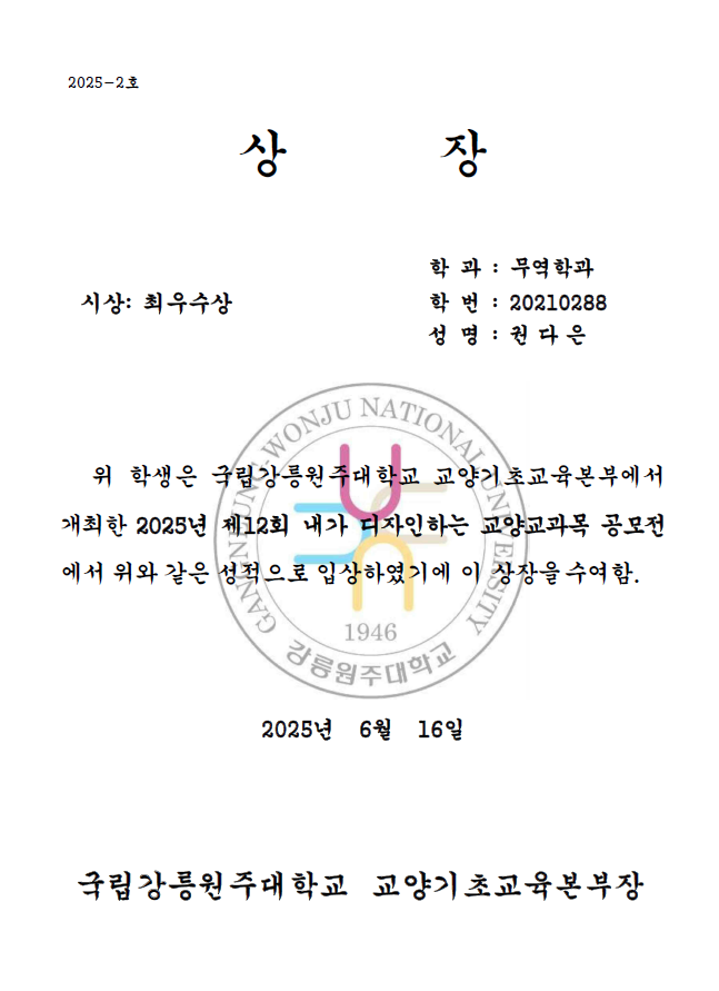 무역학과 21학번 권다은 학생, 제12회 내가 디자인하는 교양교과목 공모전 '최우수상' 수상